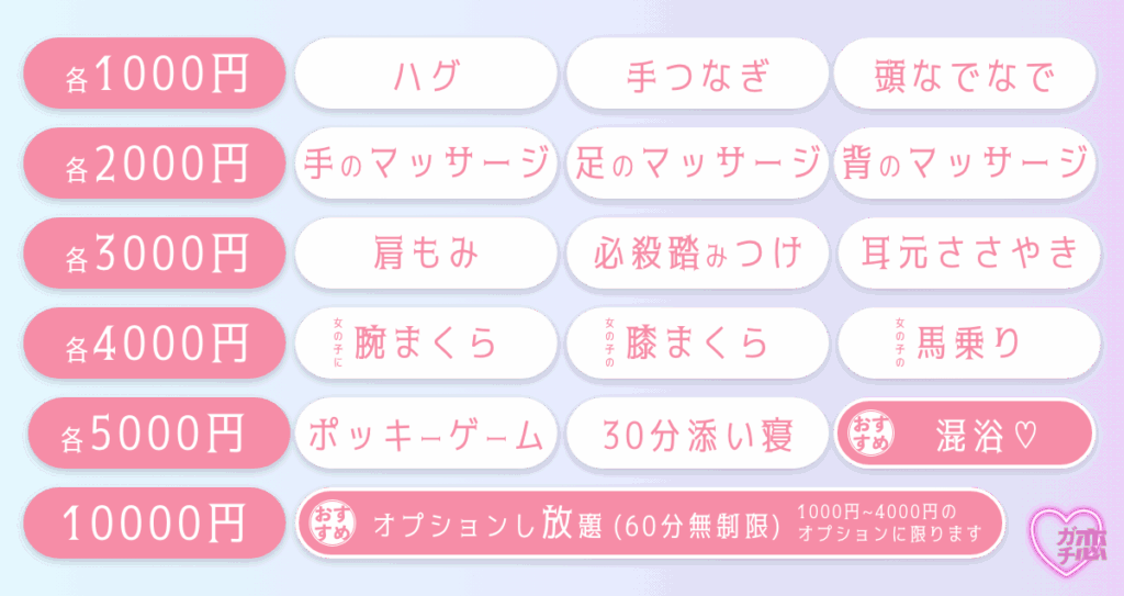 当店のコース代金は、キャストを派遣するための時間料金として頂戴いたします。必ずキャストとの対面時にご精算ください。